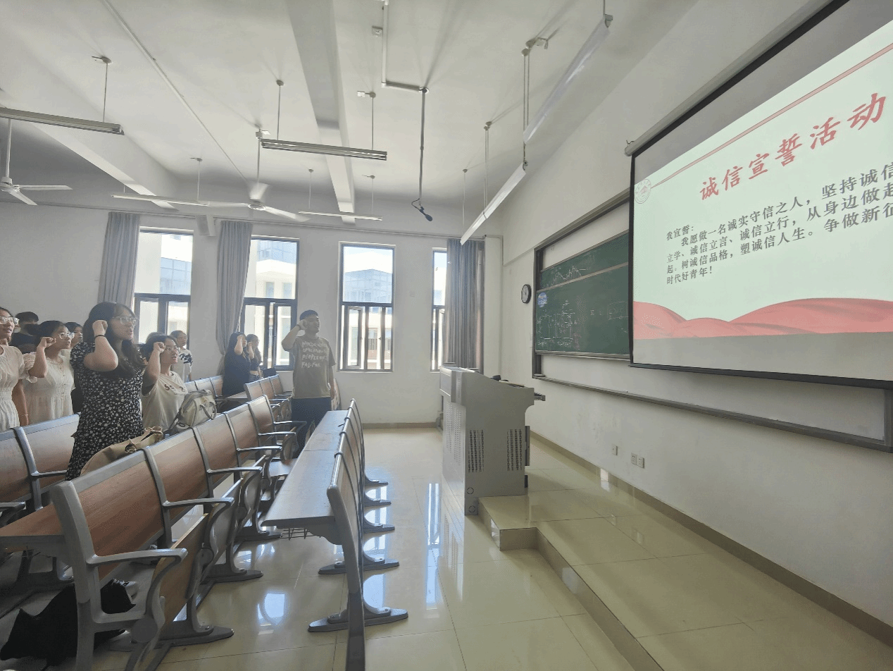 为培养学生树立诚信意识,弘扬诚信美德,pp电子官方网站组织各班级举办了诚信励志宣誓活动。参与活动的全体同学在辅导员或班长的带领下齐声宣读诚信誓词。宣读誓词过程中,同学们表情庄重,宣誓声富有激情,展示出学院学子对诚信意识培养的重视和对营造守信良好环境的决心。