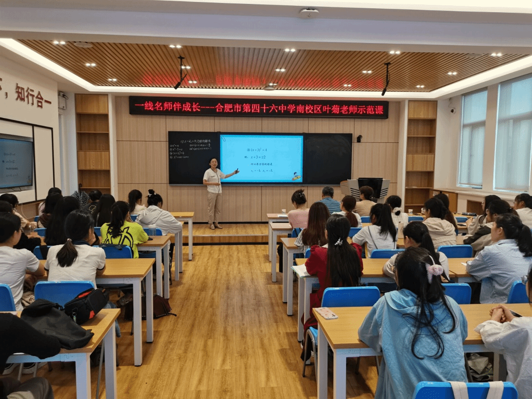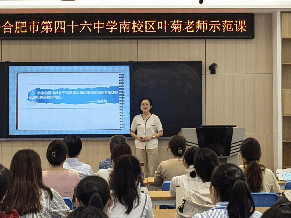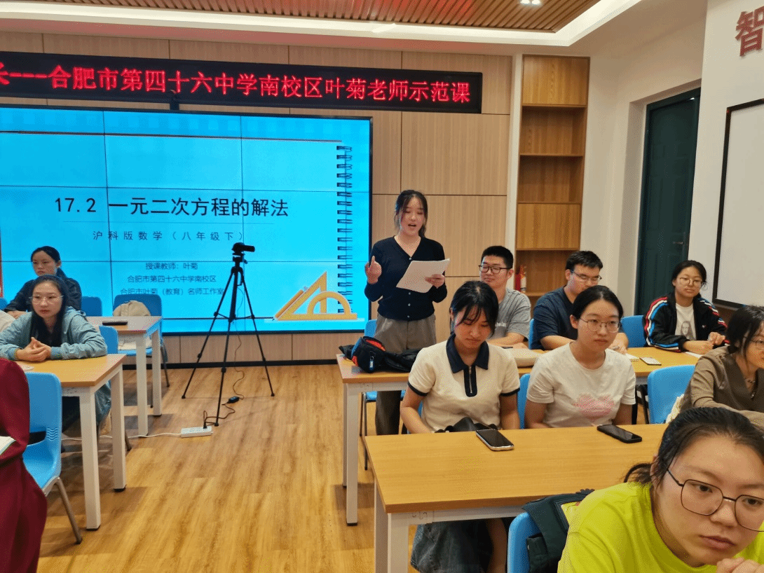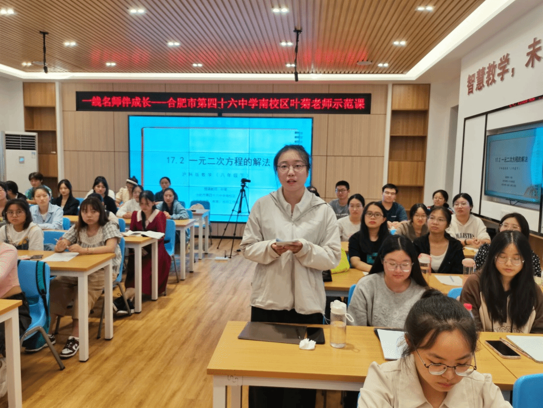 本网讯 9月20日下午,pp电子官方网站在锦绣校区逸夫楼B401智慧教室举办了“一线名师伴成长”活动,邀请了合肥市第四十六中学南校区的中学数学高级教师、安徽省五一劳动奖章获得者叶菊老师为师范生上了一节示范课,并为师范生指导教学技能。pp电子官方网站副院长杨刘、副院长黄浩,课程与教学论方向教师及来自数学与应用数学专业的部分师范生、学科教学(数学)方向教育硕士研究生共50余人参加本次活动,活动由黄浩主持。