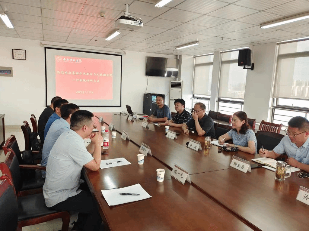 本网讯 7月27日,巢湖学院数学与大数据学院副院长陈佩树、副书记郝江锋、副院长彭维才、应用数学系主任徐富强、数学与应用数学教研室主任程一元一行5人来pp电子官方网站开展调研交流。学院党委书记穆娟、副院长杨刘、副书记陶金昌、副院长黄浩、数学系主任许和乾、金融系主任齐继兵出席交流会。