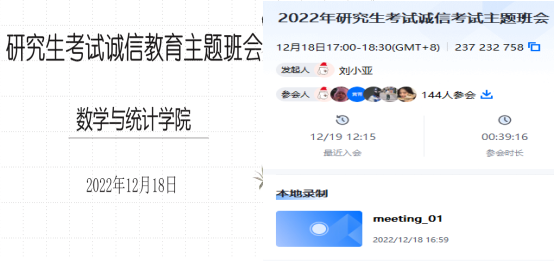 毕业班辅导员刘全亚利用腾讯会议开展线上主题班会。会上,刘全亚带领毕业班学生学习《教育法》、《国家教育考试违规处理办法》、《普通高等学校招生违规行为处理》以及《合肥师范学院学生考试违规处理办法》等相关规定,对学生提出“认真备考、诚信应考”的要求。会上还提醒同学们要关注安徽省教育厅发布的通知公告,严格按照要求进行健康打卡和核酸检测。临近考试,刘全亚鼓励同学们调整好自己的心态,做好防护,踢好临门一脚,争取最后的胜利!