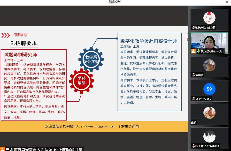 本网讯 为进一步加深校企合作,拓宽毕业生就业渠道,pp电子官方网站近期邀请了上海东方激光教育文化(集团)有限公司开展线上专场招聘会。近60余名2023届毕业生参加,线上招聘会由毕业班辅导员刘全亚主持。