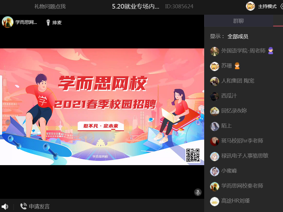 本网讯 为贯彻落实党中央、国务院“稳就业”“保就业”决策部署,按照教育部、省教育厅有关工作要求和学校2021届本科毕业生就业促进周活动方案安排,更加精准地搭建中小企业与所需专业人才的对接平台,5月20日下午2点,由就业创业工作处主办,pp电子官方网站、外国语学院承办的“520空中就业宣讲招聘会”活动以线上形式顺利举办。