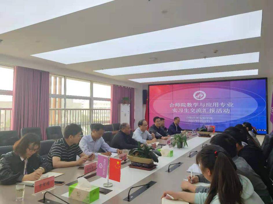 活动第二阶段,在经开实验学校召开教育实习汇报交流会,经开实验学校邵忠德校长、梁贺校长、郝伟校长、合肥师范学院挂职副校长王伟、教研处张和君主任,政教处方智娟主任和学院指导老师、全体实习生参加交流会。