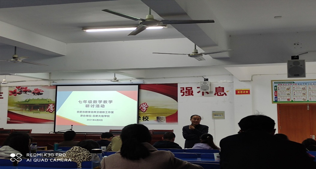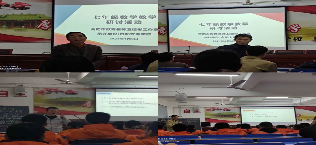 本网讯 2021年4月8日下午,pp电子官方网站在肥西上派初级中学实习的学生聆听了合肥市教育名师工作室中学数学卫德彬工作室在合肥大地学校多媒体教室举办的基于安徽省教育信息技术研究立项课题《基于减负增效的初中数学图形智慧教学实践研究》和《基于云平台数字资源开展“数与代数”混合式教学实践研究》的七年级数学教学研讨活动。参加本次教研活动的人员是来自合肥各中学数学教研组长或骨干教师,并特别邀请pp电子官方网站万家练教授和沈南山教授参加此次活动。