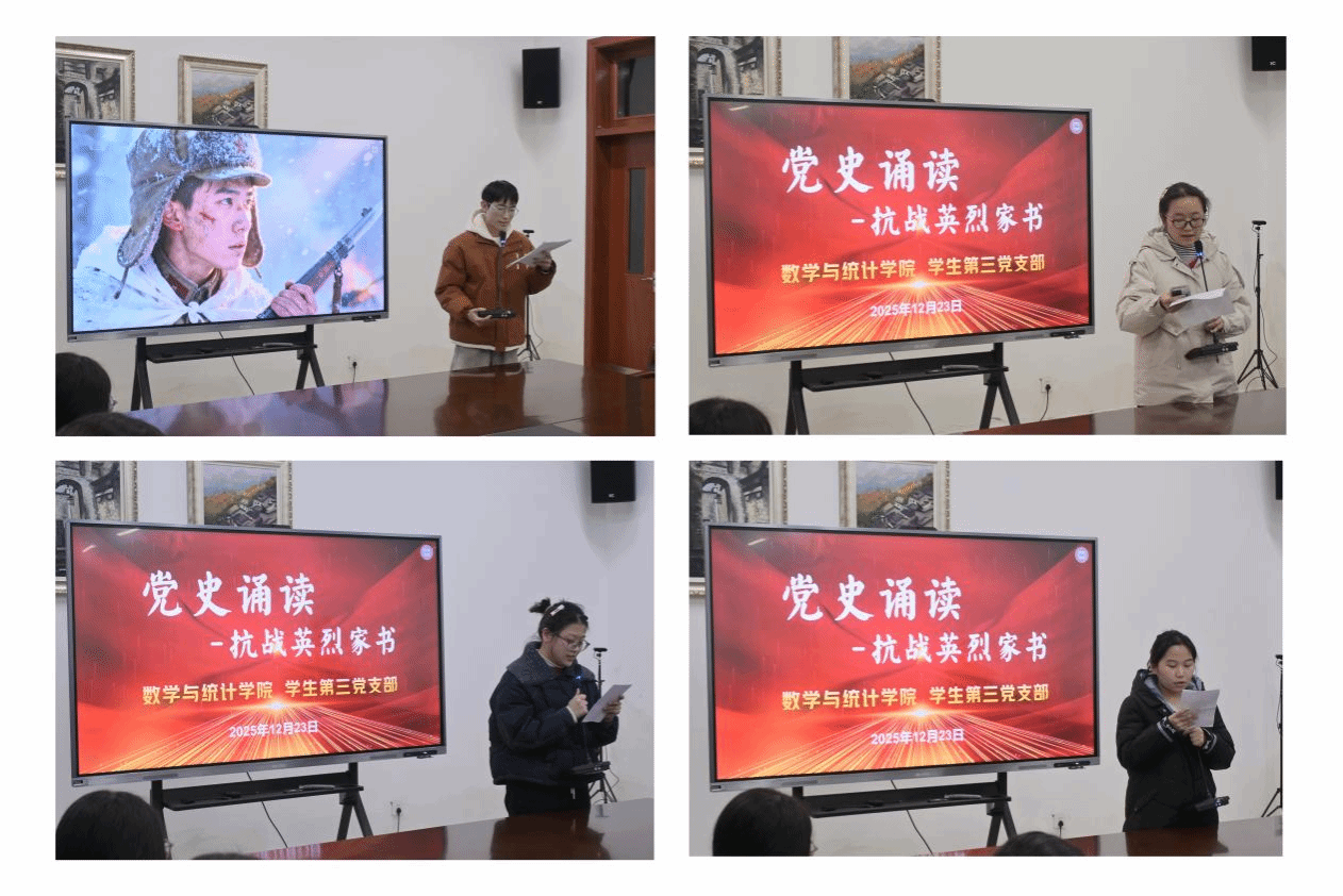 为深入学习贯彻习近平新时代中国特色社会主义思想和党的二十届四中全会精神,推动党史学习教育走深走实。2025年12月23日晚pp电子官方网站学生第三党支部在滨湖校区第一会议室开展“党史诵读——抗战英烈家书、革命故事”主题党日活动。