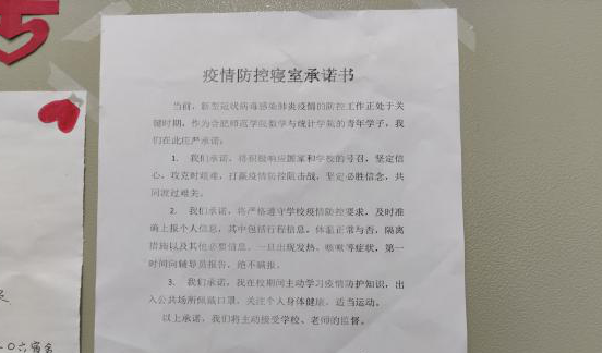 在会议结束后,刘全亚给每个宿舍发放了寝室安全承诺书,寝室人员签字并张贴在宿舍内来提醒大家提高防范意识,用心预防危险的发生,为构建平安和谐校园尽自己的一份力。