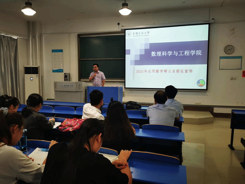 首先,安徽工业大学数理科学与工程学院系主任杨刘分别从安徽工业大学及数理科学与工程pp电子、应用数学硕士点概况、学科和研究方向、培养条件与成果等方面进行了详细讲解,重点介绍了学院在师资队伍、研究方向、人才培养等方面的优势,鼓励我校学子积极报考,实现人生理想。