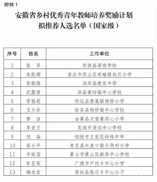 据悉,根据教育部教师工作司、中国教师发展基金会《关于实施2023年乡村优秀青年教师培养奖励计划的通知》和安徽省教育厅《关于推荐2023年乡村优秀青年教师培养奖励计划人选的通知》精神,经学校提名推荐、县级考核推荐、市级评审推荐,并经“安徽省2023年乡村优秀青年教师培养奖励计划评选推荐委员会”集体评议投票表决,此次安徽省共产生了国家级推荐人选13名,省级人选21名。