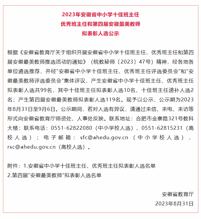 据悉,本次安徽省中小学十佳班主任、优秀班主任和第四届安徽最美教师共有218位老师入选,他们将充分发挥教师队伍先进典型的示范引领作用,积极营造全社会尊师重教的良好氛围,激励广大教师争做有理想信念、有道德情操、有扎实学识、有仁爱之心的新时代“四有”好老师。(发展规划处(校友办))