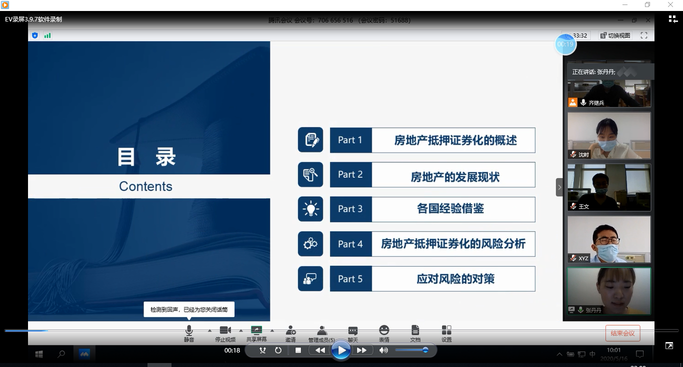 2016级金融工程班共有53名同学,其中19名同学具备免答辩资格,此次答辩共有31名同学参加。本次毕业论文答辩运用“腾讯会议”平台开展,学生在线进行答辩,答辩小组教师在办公室在线点评。答辩学生按顺序依次进入会议,通过“共享屏幕”进行PPT答辩陈述,陈述结束后答辩组教师分别进行提问与点评。同学答辩结束离开会议平台,答辩小组教师评定成绩后,在答辩小组QQ群内通知下一位同学进入会议,依次有序进行答辩。