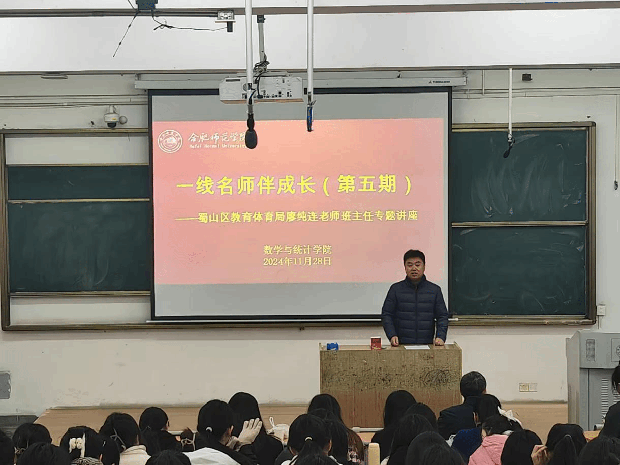 为落实“学生中心”教育理念,提升数学师范生班主任工作技能,进一步丰富教育见习的内容和形式,11月28日上午,pp电子官方网站在锦绣校区博约楼112教室举办了“一线名师伴成长”第五期活动。此次活动邀请了安徽省教坛新星、安徽省优秀教师、安徽省优秀班主任、蜀山区教育体育局教研室副主任廖纯连老师为数学师范生带来了一场班主任专题讲座。学院副院长黄浩、数学系主任许和乾,2022级数学与应用数学(师范)专业的学生参加了本次活动,活动由许和乾主持。