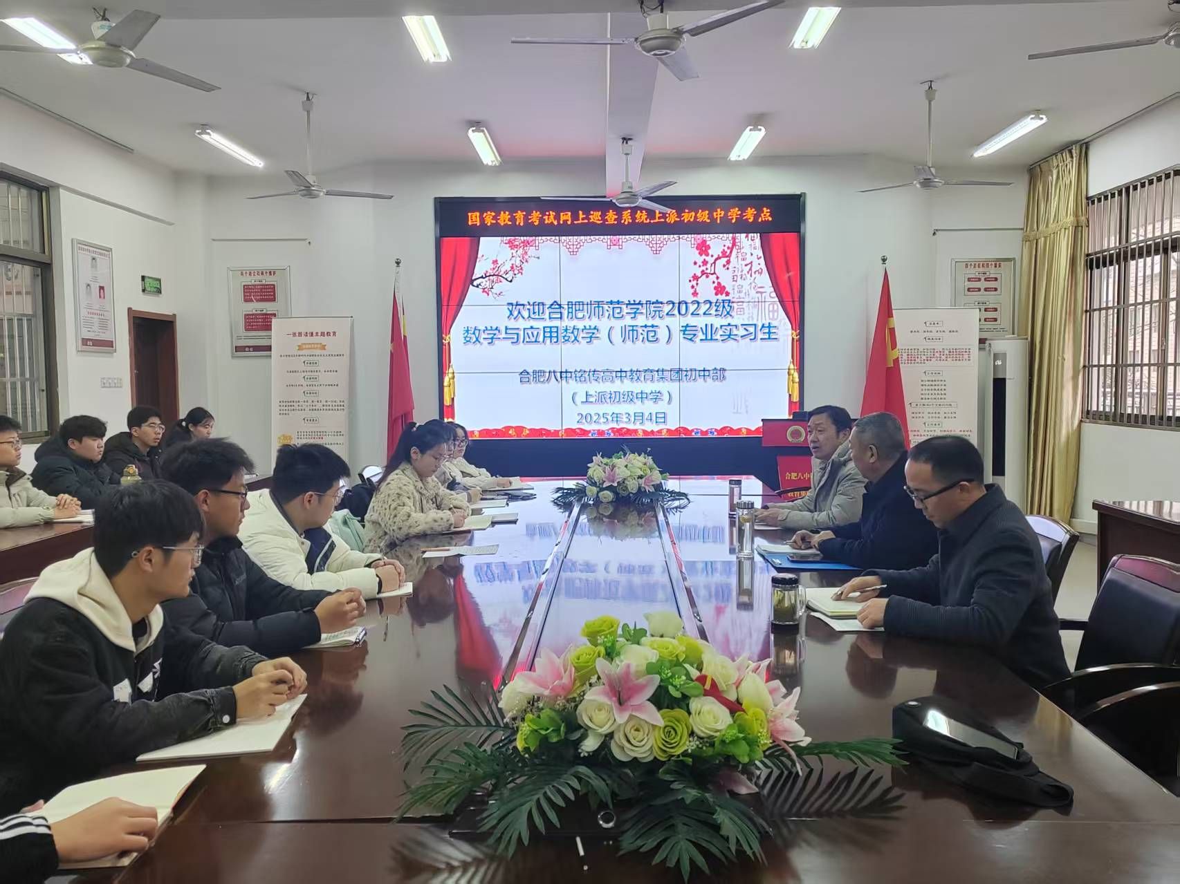 为提升师范专业学生学科素养和教学技能,提升理论素养,培养具备扎实理论知识和教学技能的优秀教师,3月4日上午,pp电子官方网站2022级数学与应用数学(师范)专业19名实习生在张新全老师的带领下,赴肥西县上派初级中学开展为期14周的教育实习。教育实习见面会在上派初级中学罄心楼二号会议室举行。