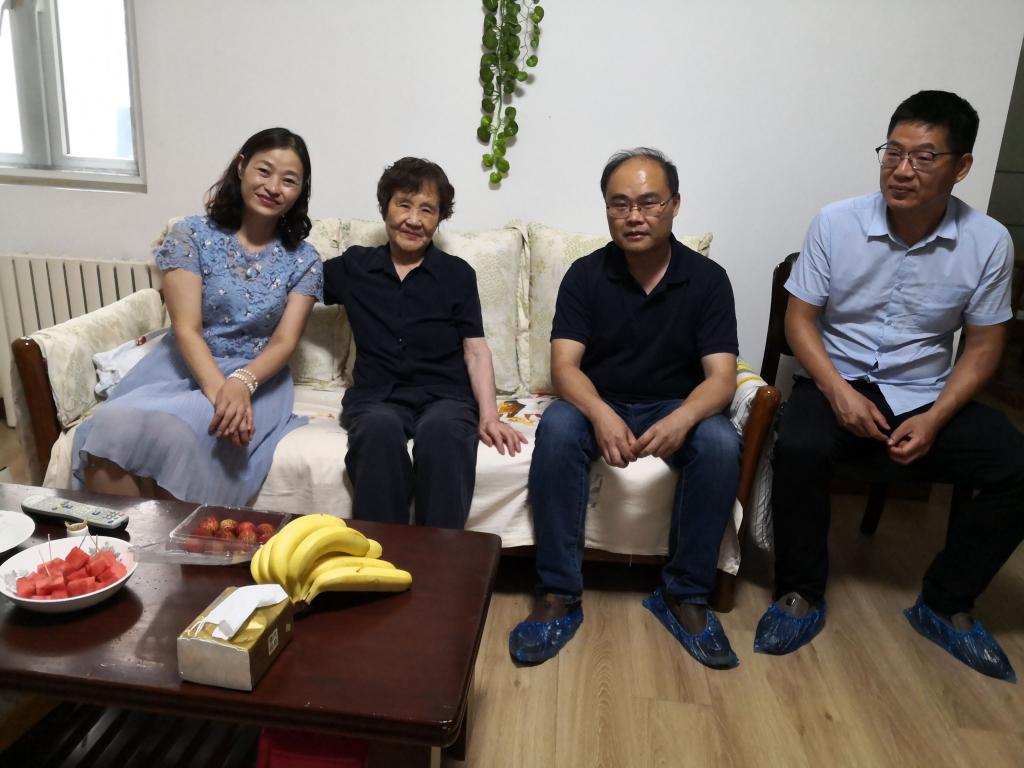在滕德贵老师家中,几位领导亲切关心滕老师的身体状况,并介绍了学院目前的发展状况,特别嘱咐滕老师要多注意身体。聊天中,滕老师回忆了他工作之初的教学场景,以及同事们之间的往事,虽然时隔久远,滕老师却如数家珍,历历在目,充分体现了老一辈教师对教育事业的热爱与奉献。