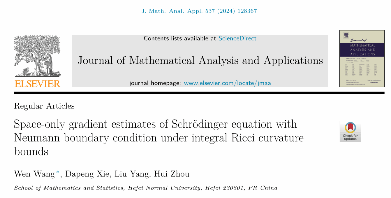 近期,pp电子官方网站“基础数学”省级重点学科微分方程与动力系统团队教师王文、解大鹏、杨刘、周辉在几何偏微分方程方向取得进展,相关成果Space-only gradient estimates of Schrödinger equation with Neumann boundary condition under integral Ricci curvature bounds在JCR二区期刊《Journal of Mathematical Analysis and Applications》公开发表。