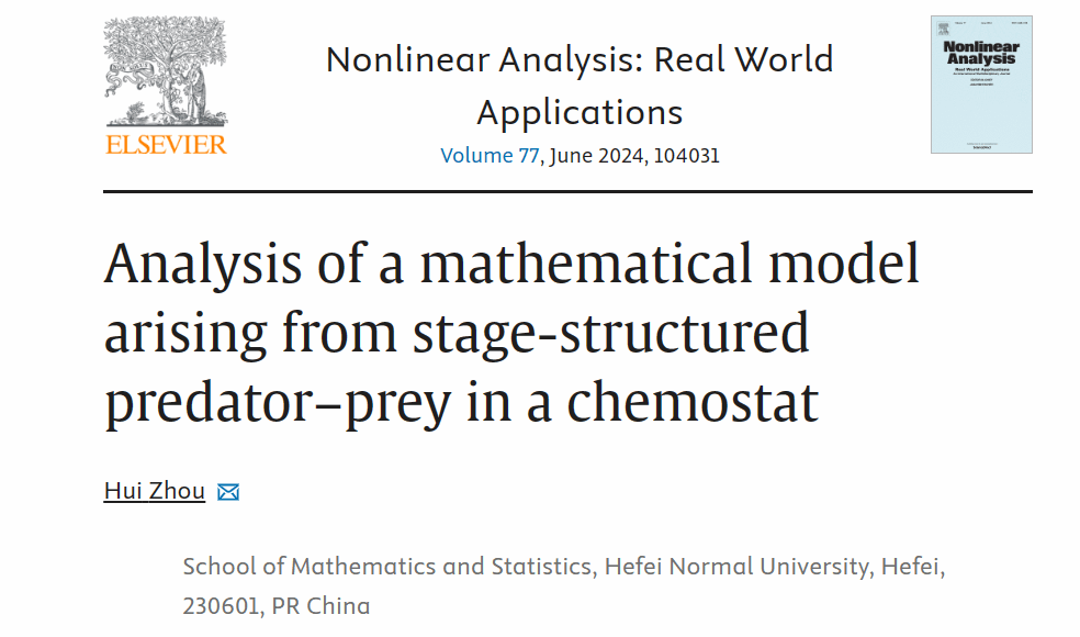 近期,pp电子官方网站“基础数学”省级重点学科微分方程与动力系统团队教师周辉在恒化器中具年龄结构的捕食-被捕食系统数学模型的动力学分析领域取得进展,相关成果Analysis of a mathematical model arising from stage-structured predator–prey in a chemostat在JCR二区期刊《Nonlinear Analysis: Real World Applications》公开发表。